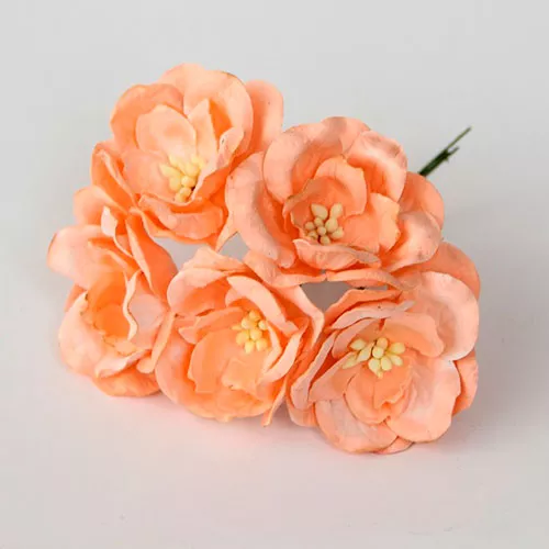 В наборе 5 многослойных цветочков с красивыми тиснеными лепестками и оформленной тычинками сердцевинкой. Диаметр 4 см, высота бутона 2 см, длина стебелька 7 см