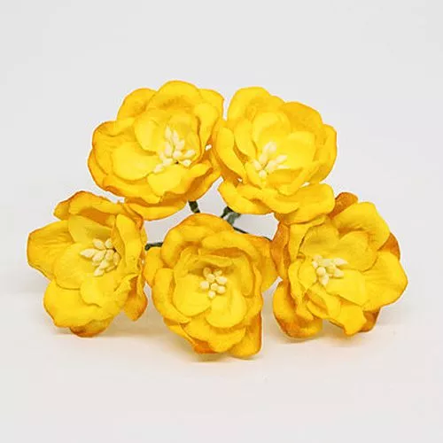В наборе 5 многослойных цветочков с красивыми тиснеными лепестками и оформленной тычинками сердцевинкой. Диаметр 4 см, высота бутона 2 см, длина стебелька 7 см