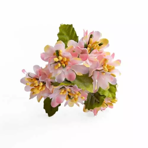 В букете 6 проволочных веточек в бумажной обмотке (длина 12 см), диаметр цветов 3 см, размер листочков 2,5х1,3 см. Сердцевинки украшены тычинками