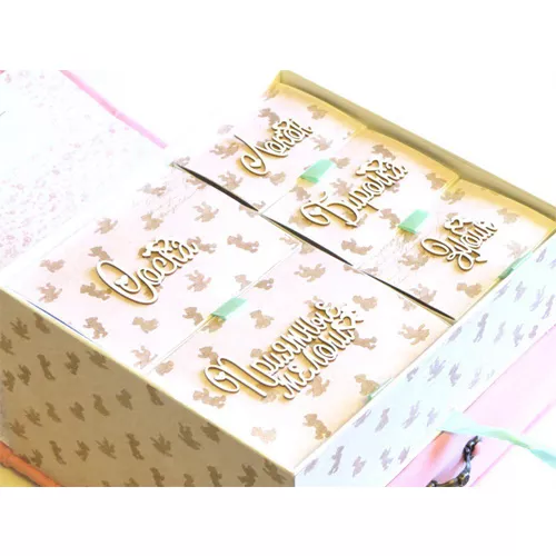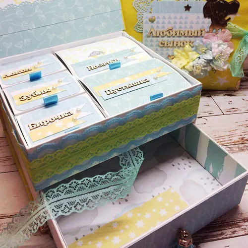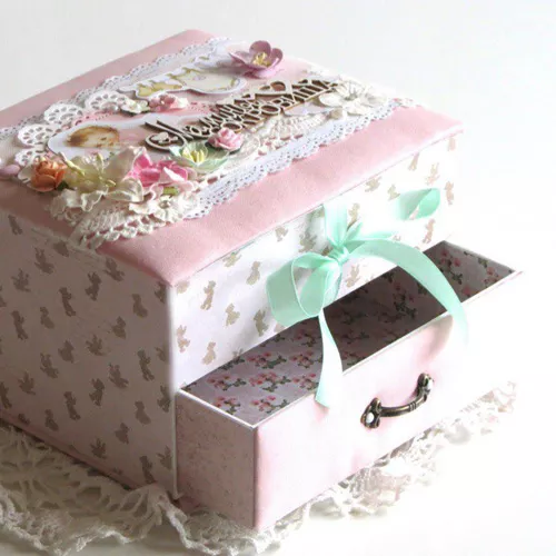Чудесная конструкция для создания маминой сокровищницы или хранения ценных мелочей. Состоит из основы (размер 16х18х10 см), выдвижного ящика (размер 17,2х15,4х4,7 см), 3 маленьких коробочек с откидной крышкой (размер 4,8х7х3,8 см) и 2 больших (размер 7,2х9,4х3,8 см). Основа и выдвижной ящик выполнены из толстого переплетного картона, коробочки из плотной бумаги. Для такой заготовки можно создать, проявляя фантазию, свою особенную крышечку, которая подходит именно Вам