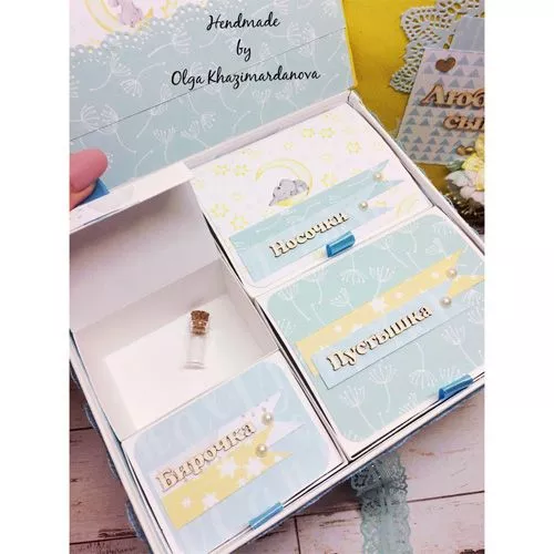 Чудесная конструкция для создания маминой сокровищницы или хранения ценных мелочей. Состоит из основы (размер 16х18х10 см), выдвижного ящика (размер 17,2х15,4х4,7 см), 3 маленьких коробочек с откидной крышкой (размер 4,8х7х3,8 см) и 2 больших (размер 7,2х9,4х3,8 см). Основа и выдвижной ящик выполнены из толстого переплетного картона, коробочки из плотной бумаги. Для такой заготовки можно создать, проявляя фантазию, свою особенную крышечку, которая подходит именно Вам