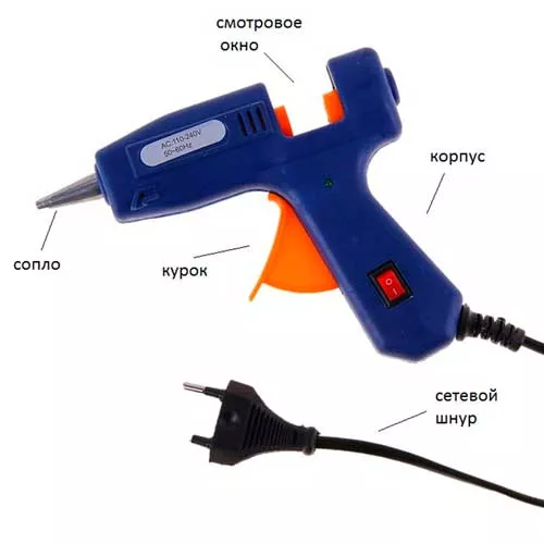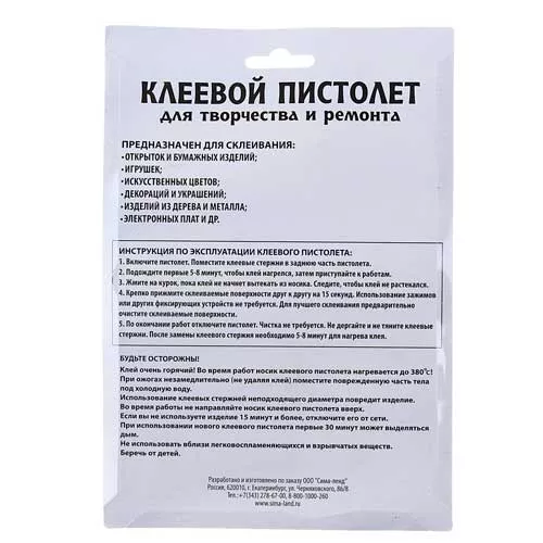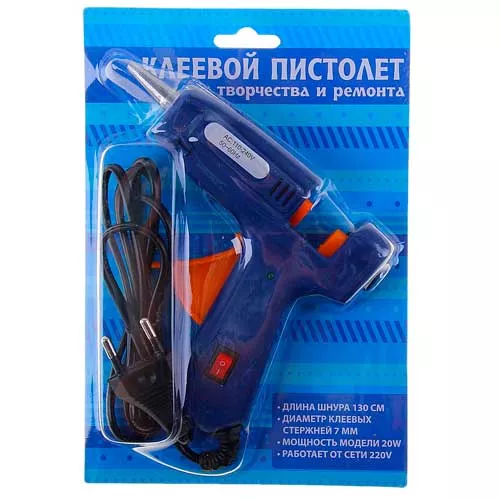 Рассчитан на 220v. Клеевой пистолет работает со стержнями диаметром 7 мм, которые продаются отдельно. Предназначен для работы с бумагой, деревом и металлом