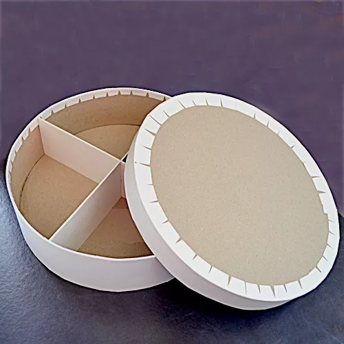 Отличная заготовка для маминой сокровищницы. Диаметр коробки 25,4 см, диаметр крышки 26 см, высота с крышкой 7,2 см. Внутри 4 ячейки размером 12,3х12,3 см. Перегородки легко вытаскиваются, пустую коробочку можно использовать для хранения альбома круглой формы. Теперь творить стало еще проще!