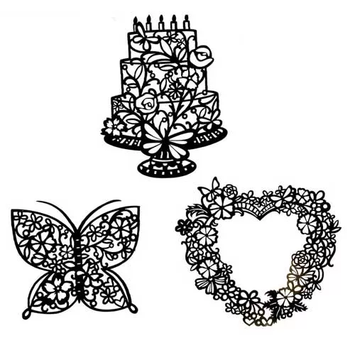 В наборе 3 пластиковые вырубки, покрытые бархатом. Размер бабочки 8х7 см, размер сердца 10,3х9,5 см, размер тортика 8х10 см