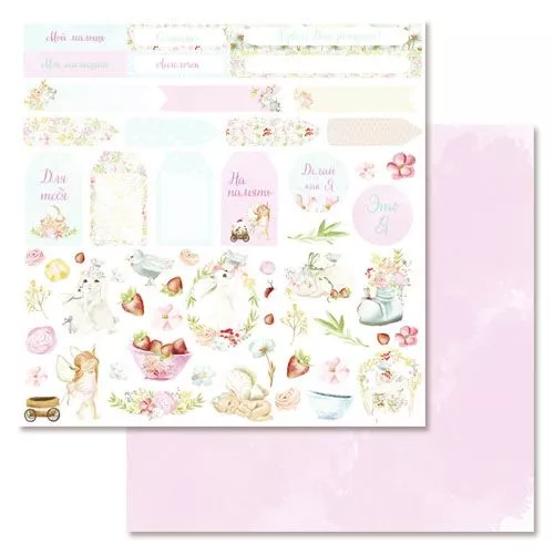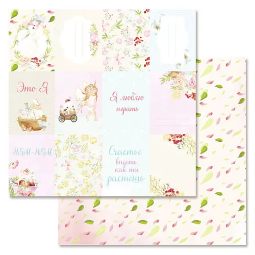 В наборе 9 двусторонних листов различного дизайна. Плотность бумаги 180 гр/м2. Легкая детская коллекция в светлых, нежных тонах с милыми зайками и феечками. Такой набор идеально подойдет для малышковых альбомов, в нем Вы найдете 2 листа с различными элементами для вырезания (карточки, теги, картинки). Уникальные дизайны подобраны специально для Вашего вдохновения!