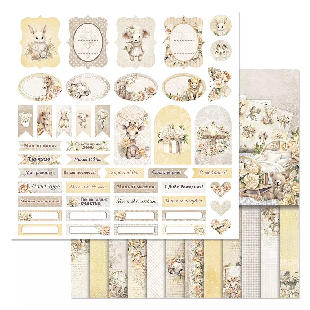 В наборе 9 двусторонних листов разного дизайна, 2 двусторонних листа с картинками и 1 двусторонний лист с карточками. Плотность 180 гр/м2. Нежная, мягкая и очень милая детская коллекция с очаровательными зверятами. Приятная цветовая гамма в кремово-бежевых оттенках добавит умиротворенности вашему творчеству. Коллекция универсальна - она подходит и мальчикам, и девочкам