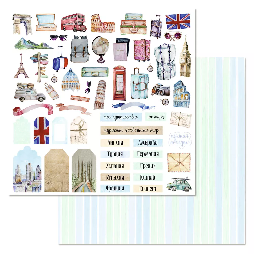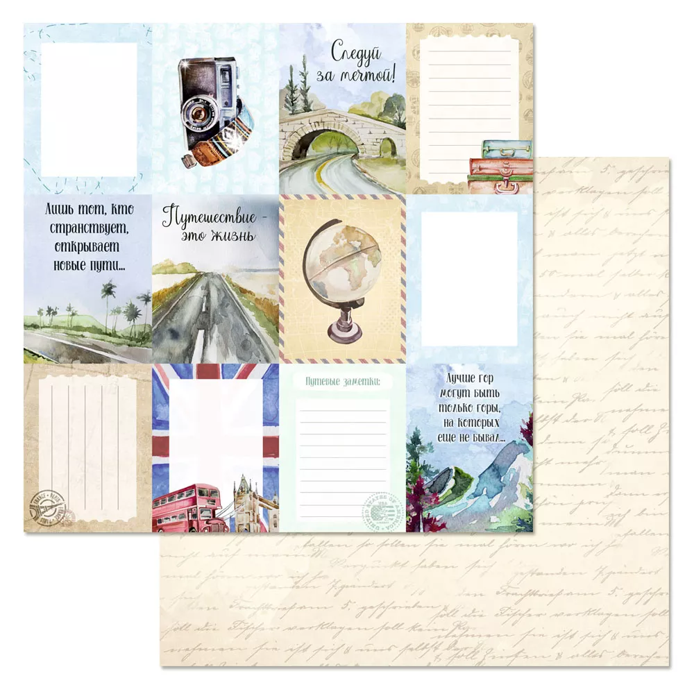 В наборе 10 двусторонних листов разного дизайна, 1 двусторонний лист с ярлычками для вырезания и 1 двусторонний лист с карточками. Плотность 180 гр/м2. Отправляясь в путешествие, не забудьте взять с собой фотоаппарат, хорошее настроение и особый настрой, чтобы поймать как можно больше вдохновения. Здесь Вы побываете на высоте величественных гор, вдохнете воздух туманного Лондона, загадаете желание на Эйфелевой башне и промчите тысячи километров по дороге, ведущей к мечте.
