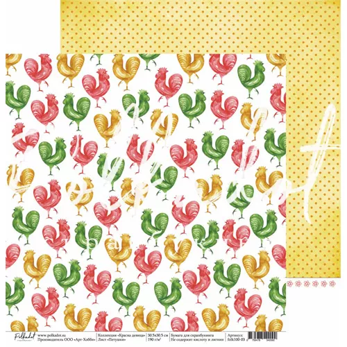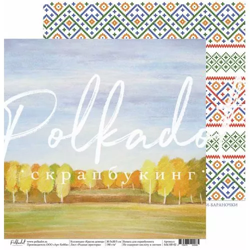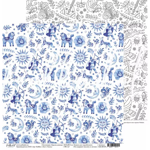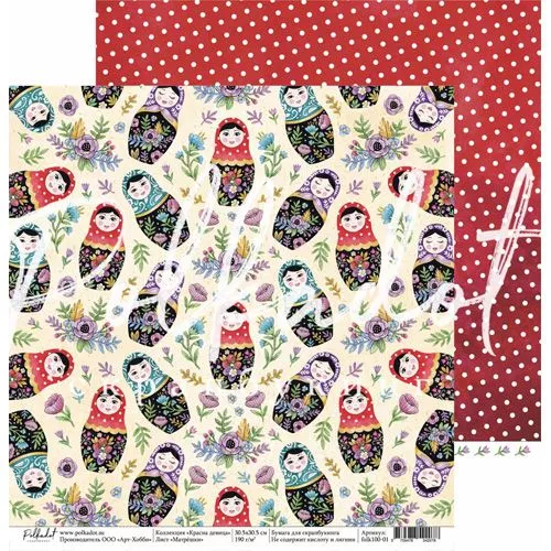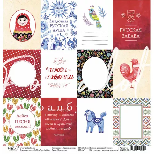 В наборе 10 двусторонних листов (по 2 листа каждого дизайна), 2 листа с картинками для вырезания и 1 лист с карточками для вырезания. Плотность 190 гр/м2. Приятным бонусом станут картинки для вырезания, расположенные на обратной стороне обложки. Красочные матрешки и расписные узоры, элементы вышивки и любимые сладости, яркие чистые цвета и интересные сочетания, знакомые с детства фразы и новый взгляд на нашу историю - все это в полной мере характеризует новую коллекцию от Polkadot