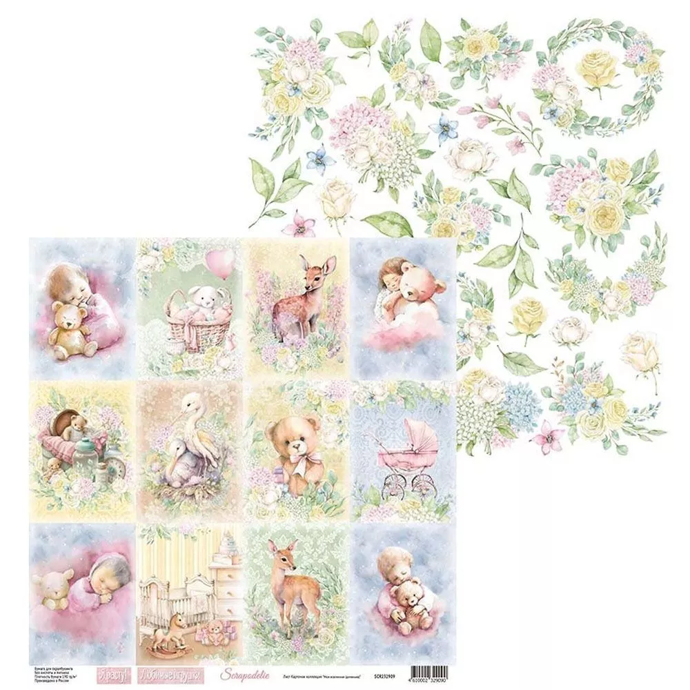 В наборе 8 двусторонних листов разного дизайна, в том числе 2 листа с картинками для вырезания. Плотность 190 гр/м2. На обратной стороне обложке расположен бонус - картинки для вырезания. Изумительная коллекция про мягкие ладошки и розовые щечки. Милые фоновые листы прекрасно будут смотреться в скрап работах для девочек