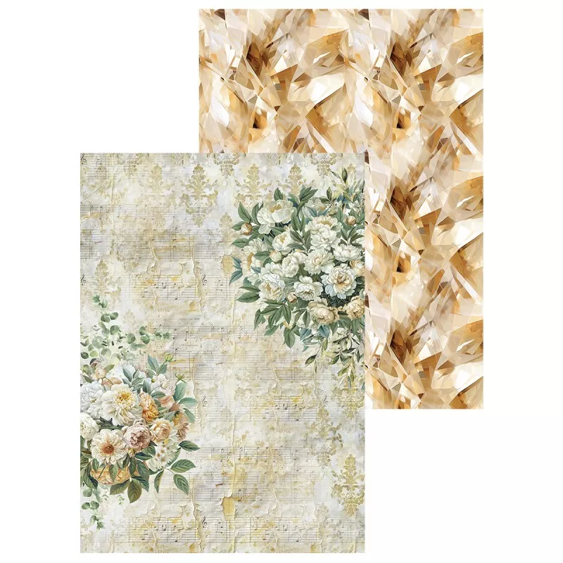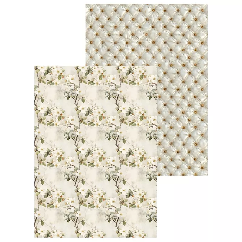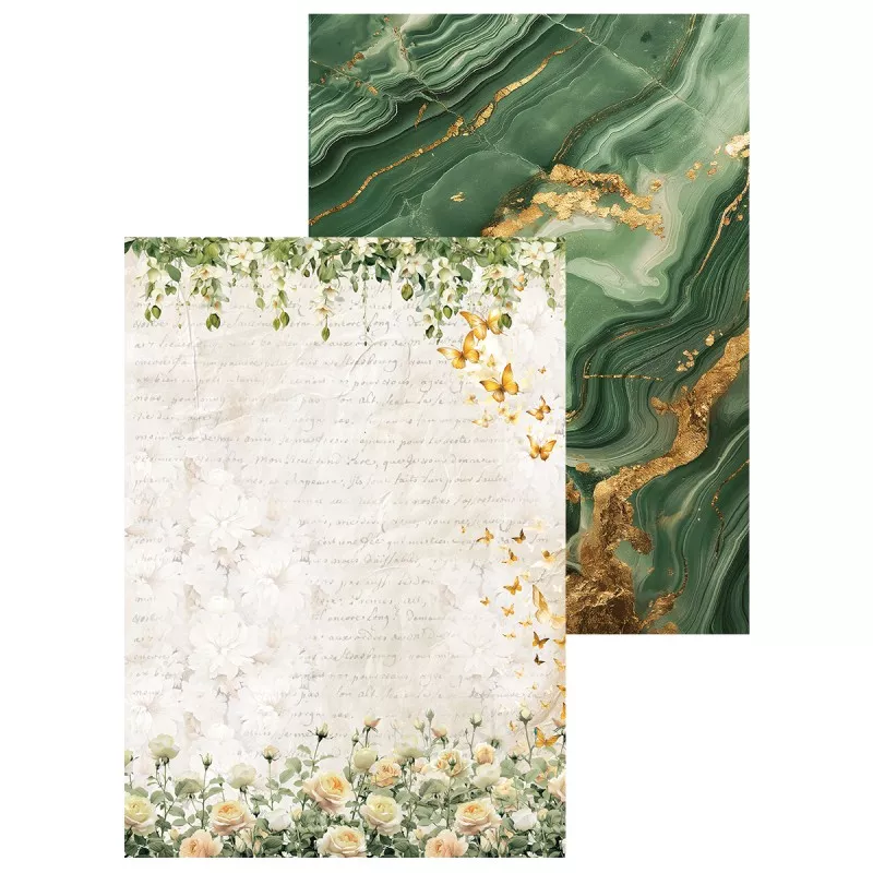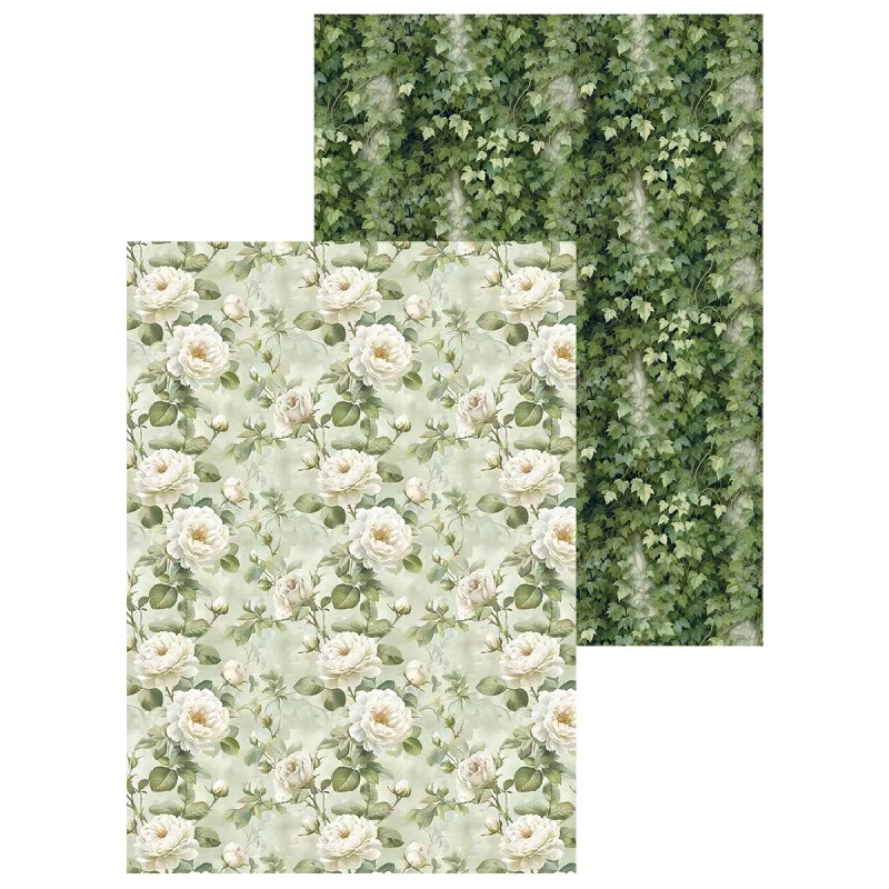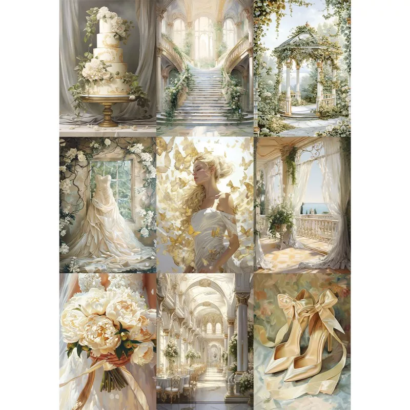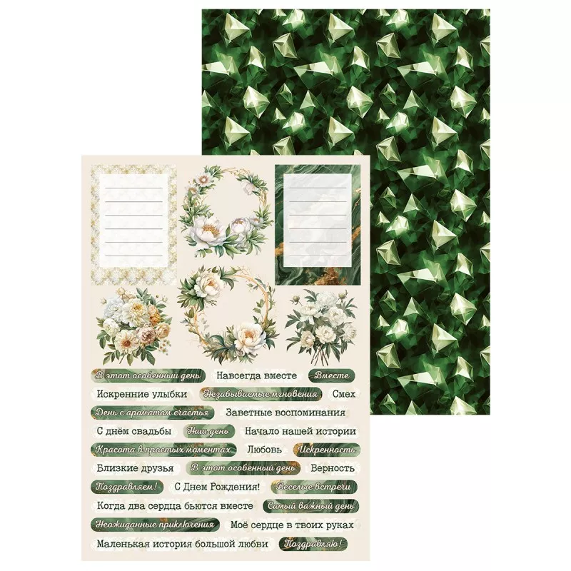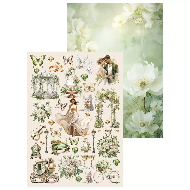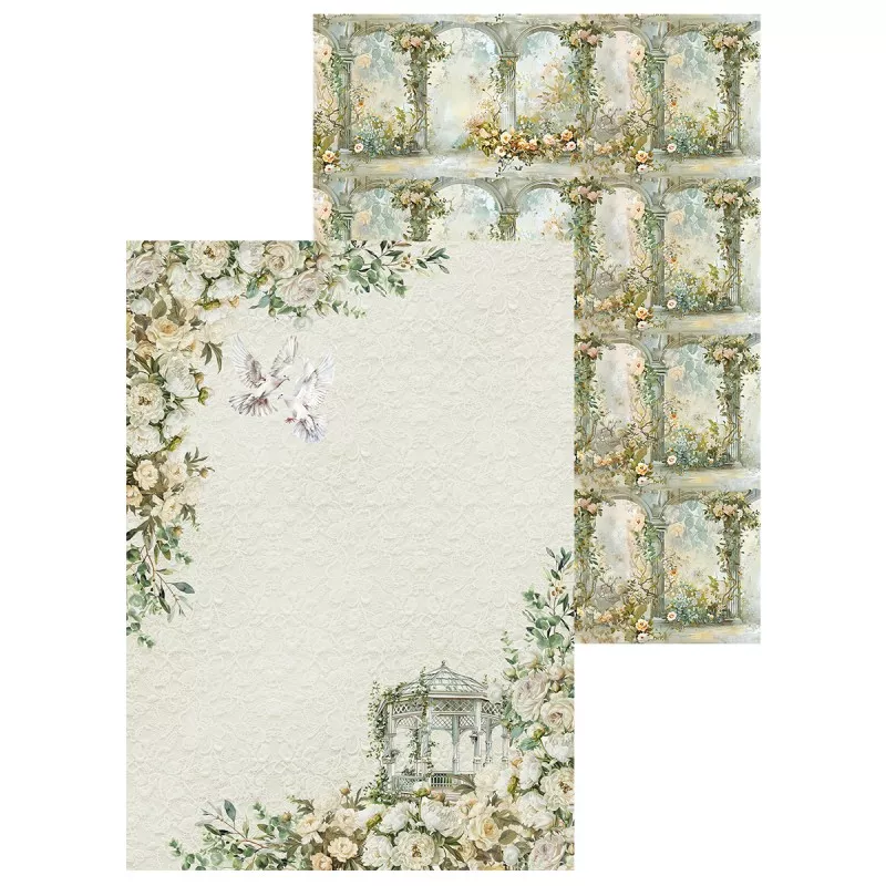В наборе 7 двусторонних фоновых листов разного дизайна и 2 листа с картинками для вырезания. Плотность 190 гр/м2. Дополнительный бонус - картинки на обратной стороне обложки. Нежная свадебная коллекция, окруженная солнечным светом, чарующей зеленью и пронизанная самыми романтичными эмоциями