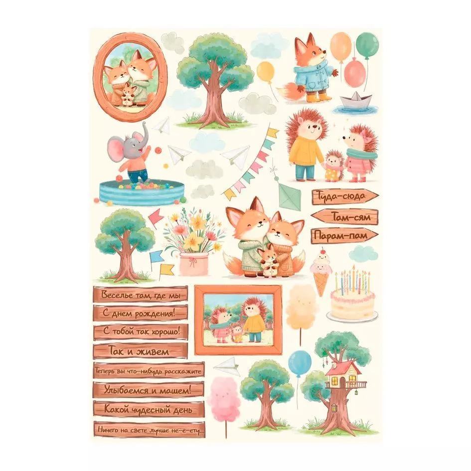 В наборе 6 двусторонних листов с фоновыми принтами, 2 двусторонних листа с картинками и карточками, 1 лист с картинками для вырезания на обороте обложки и 2 двусторонних листа 8х21 см с картинками. Плотность 190 гр/м2. Яркая и добрая бумага для творчества с милыми персонажами — белочками, слониками и ёжиками, которые собираются на прогулку в детском саду
