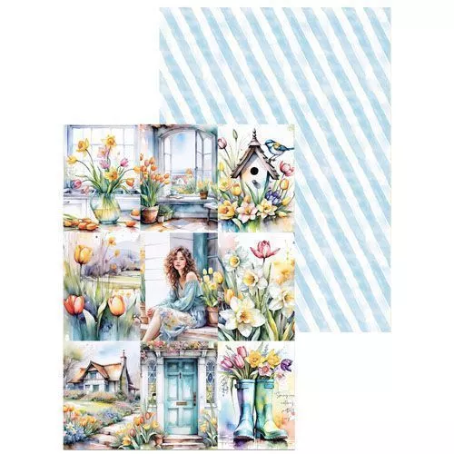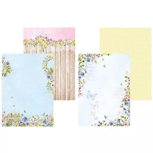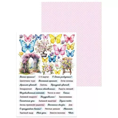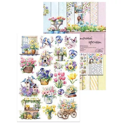 В наборе 7 двусторонних фоновых листов разного дизайна и 2 листа с надписями и картинками для вырезания. Плотность 190 гр/м2. Дополнительный бонус - картинки на обратной стороне обложки. Нежная весенняя коллекция наполненная россыпью красивых цветов