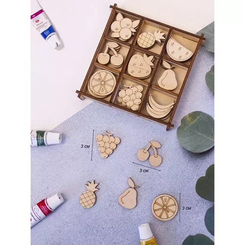 В наборе 9 дизайнов, по 4 украшения каждого вида. Средний размер 2,5х2,7 см. Деревянные фигурки упакованы в коробочку с ячейками, которую также можно использовать для воплощения творческих идей