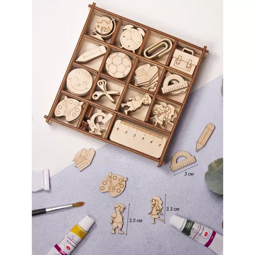 В наборе 15 дизайнов, по 6 украшений каждого вида. Средний размер 2,5х2,7 см. Деревянные фигурки упакованы в коробочку с ячейками, которую также можно использовать для воплощения творческих идей