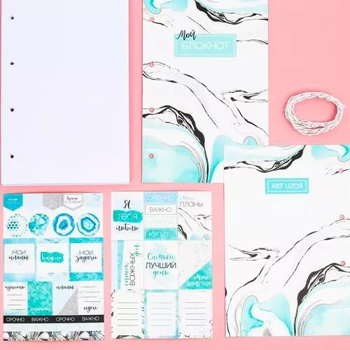 Описание Отличный набор для создания блокнота. В комплект входит блок с листами для записей, обложка, 2 листа с наклейками и хлопковый шнур с металлизированной нитью. Для вашего удобства в страницах и обложке сделаны отверстия для шнура. Размер готового блокнота 14х21 см, в блоке около 90 листов. В такой блокнот очень удобно и приятно записывать свои самые сокровенные мечты