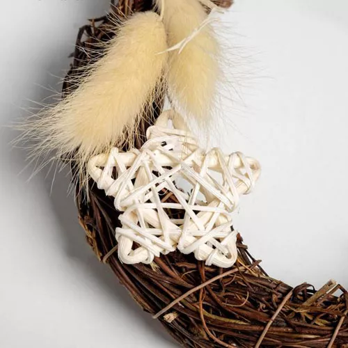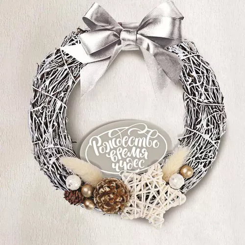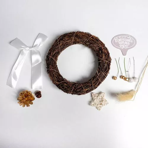 В набор входят натуральная основа для венка, сплетена из тонких веточек, вырубка, пластиковые ягодки на ветке, шарики с глиттером, шишки, сухоцветы, атласный бантик и инструкция. Размер венка 16 см