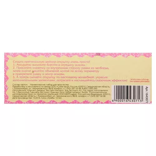 В набор входит заготовка для открытки, лист с высечками из плотной бумаги для украшения, пленка (размер 10х14,5 см), клеевые подушечки, пайетки. Размер открытки в готовом виде 13х10,5 см