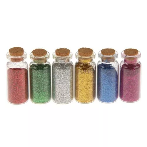 В наборе 6 стеклянных баночек с пробкой наполненных глиттером. Размер стеклянной бутылочки 2,2х5,2 см, в 1 бутылочке 6 грамм глиттера