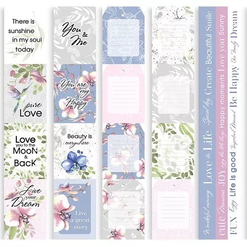 В наборе 5 листов размером 30,5х5,2 см с карточками и полосками для вырезания. На листах расположено 16 различных двусторонних карточек (размер 5,2х7,7 см) и 3 полоски с надписями. Плотность 200 гр/м2. Симпатичные дизайны и надписи вдохновляют на свежие идеи!
