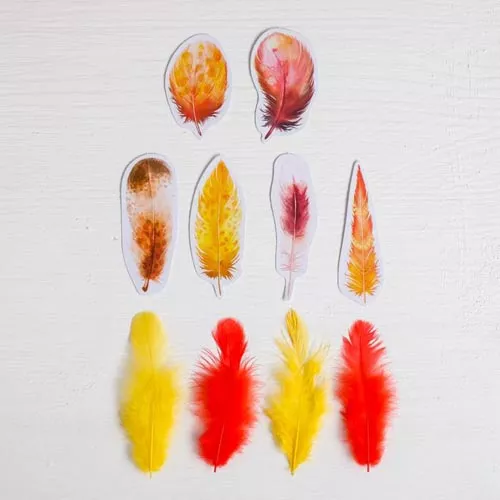 В наборе 10 перьев (4 натуральных и 6 бумажных). Средний размер 2,5х7 см