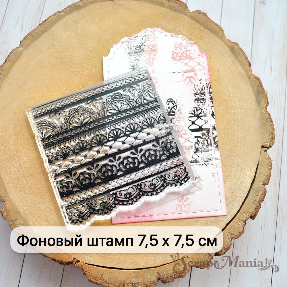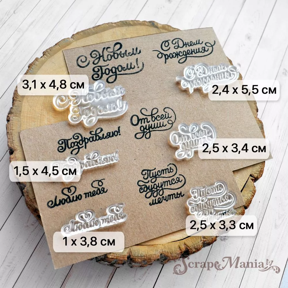 В наборе 7 полимерных штампов. Размер фонового штампа 7,5х7,5 см, "С Днем рождения" 2,4х5,5 см, "Пусть сбудутся мечты" 2,5х3,3 см, "С Новым Годом!" 3,1х4,8 см, "От всей души" 2,5х3,4 см, "Поздравляю!" 1,5х4,5 см, "Люблю тебя" 1х3,8 см. Элегантные и изысканные линии штампов придадут уникальность Вашим работам. Каждый оттиск продуман до мелочей. Изящные надписи и универсальный кружевной фоновый прекрасно дополнят любые поздравительные открытки. Штамп станет верным помощником в создании неповторимых изделий ручной работы. Уникальные дизайны подобраны специально для Вашего вдохновения! Творите волшебство своими руками
