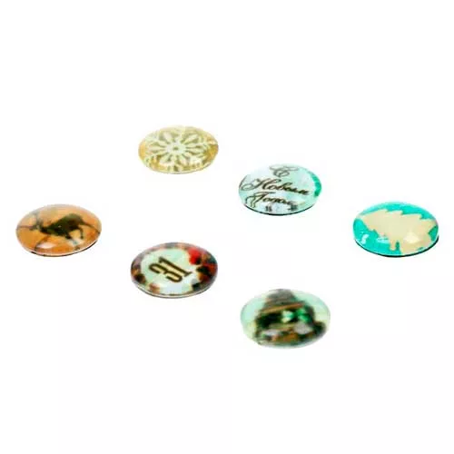 В наборе 6 украшений из прозрачного акрила с картинками внутри (как у камушков-pebbels), диаметр 6,5 см