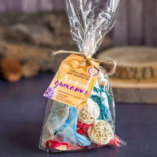 В набор входят скелетированные листья, сухоцветы, лепестки цветов, бумажные ленты и ротанговые шарики. Можно использовать как саше с тонким цветочным ароматом