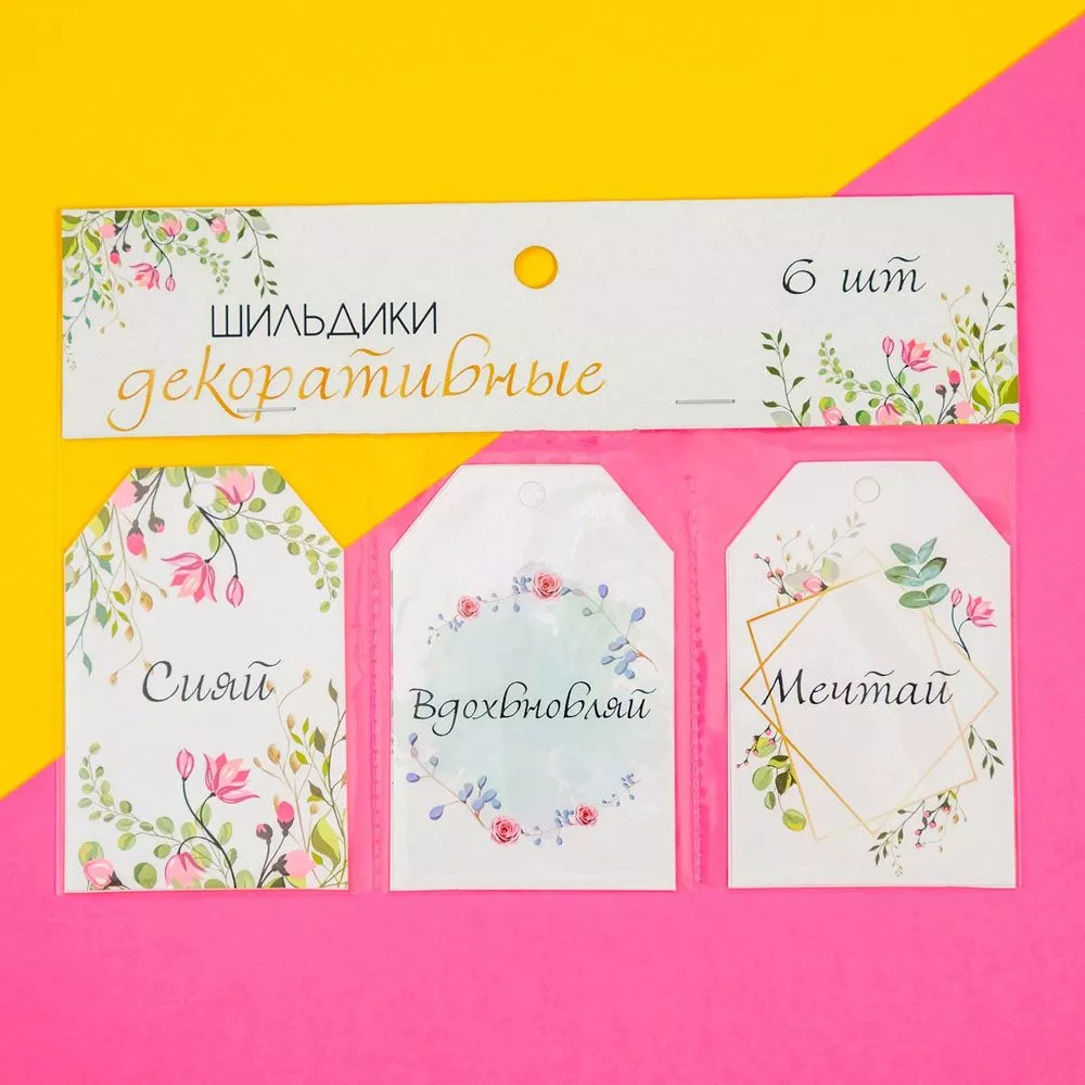 В наборе 6 шильдиков (ярлычков) размером 6х9 см и с отверстием для ленточки