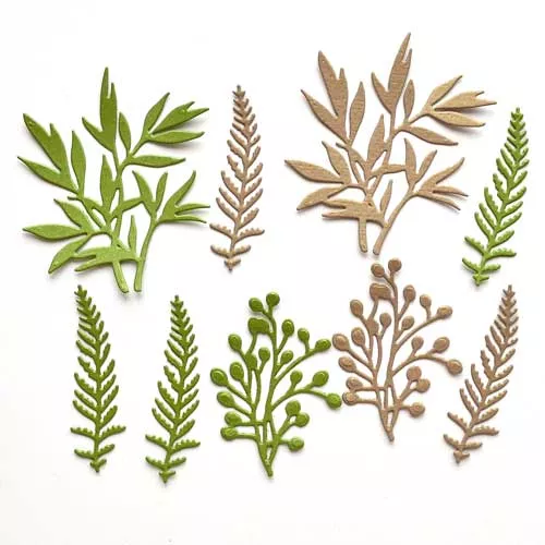 В наборе 9 веточек с листиками из жемчужного кардстока. Размеры от 1,5х6,2 см до 7,5х7,7 см