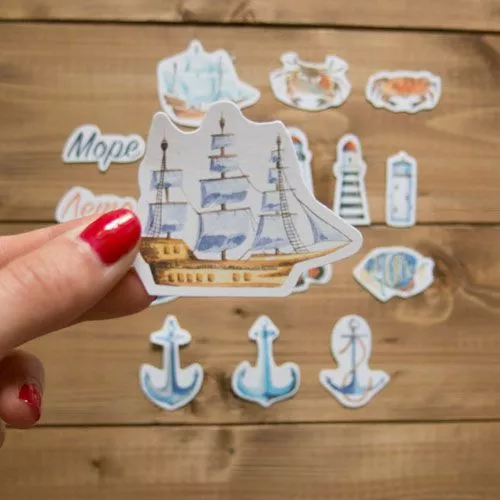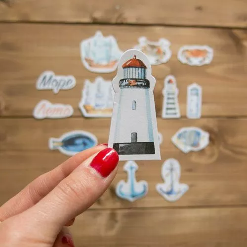 В наборе 15 вырубок из плотной бумаги (плотность 300 гр/м2). Размер от 1,8х4,5 см (маяк) до 6х5 см (корабль)