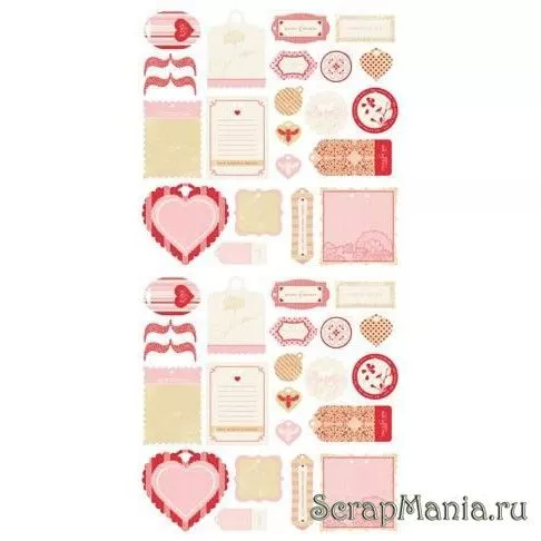 В наборе 88 элементов в виде тэгов любовной тематики. Цвета: красный, розовый, бежевый. Размер левого нижнего сердца: 9х8 см