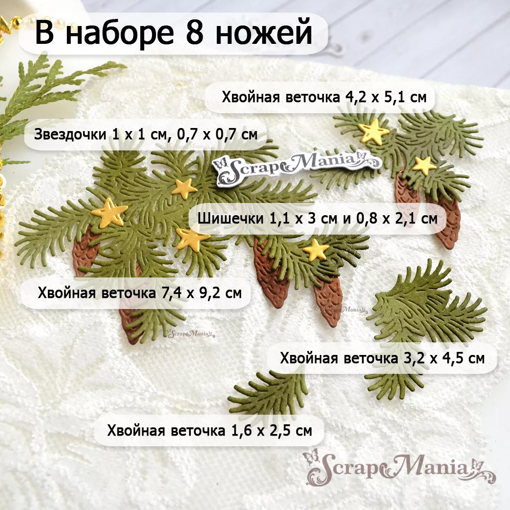 В наборе 8 ножей, соединенных перемычкой, которую при необходимости можно перекусить. Общий размер 9,7х11,1 см. Размер хвойных веток 7,4х9,2 см, 4,2х5,1 см, 3,2х4,5 см и 1,6х2,5 см, шишек 1,1х3 см и 0,8х2,1 см, звездочек 1х1 см и 0,7х0,7 см. Прекрасно подойдет для создания декора к зимним страничкам, новогодним альбомам и открыткам. Отлично сочетается ножами из серии "Ароматы Нового Года" (арт. 252284, 252287 и др)