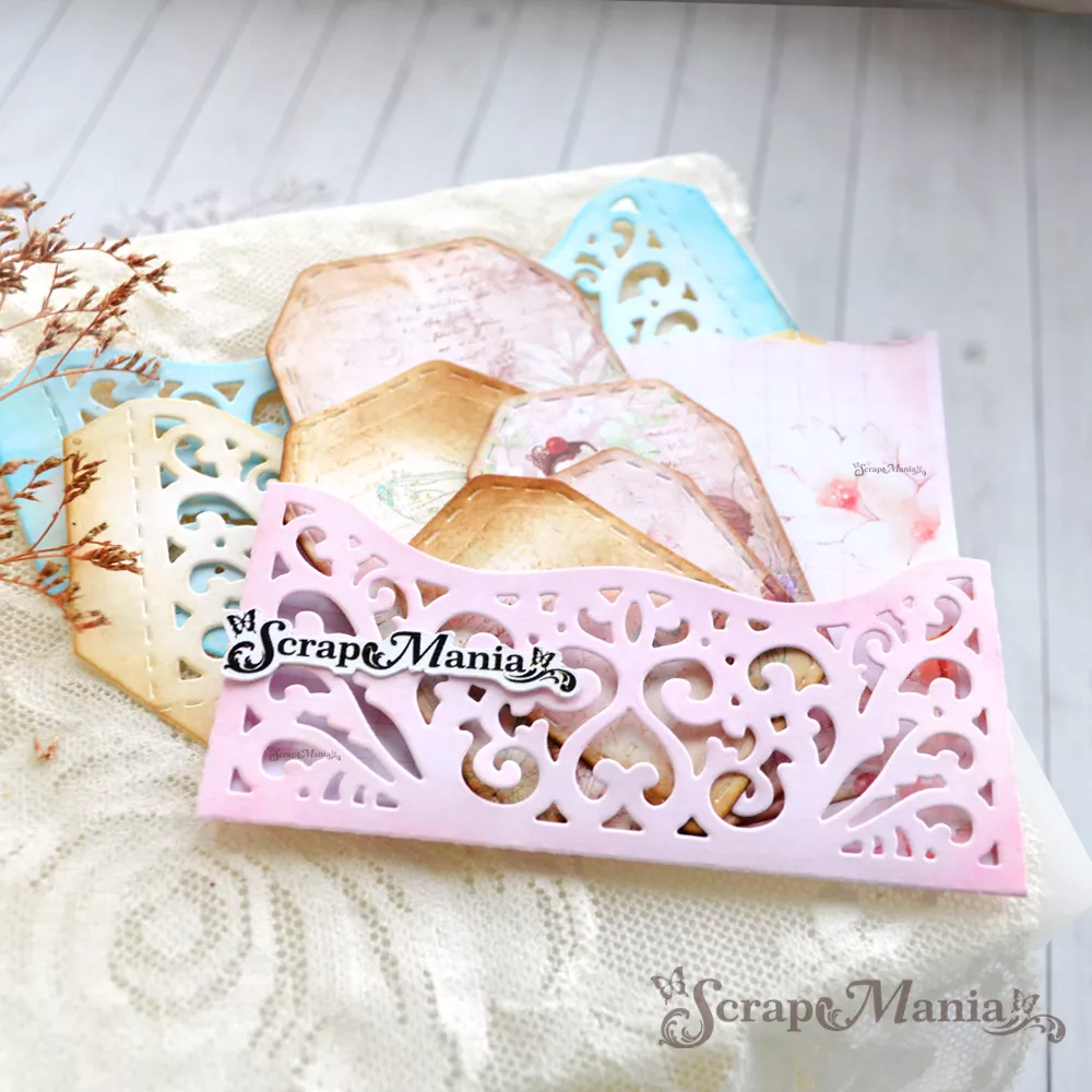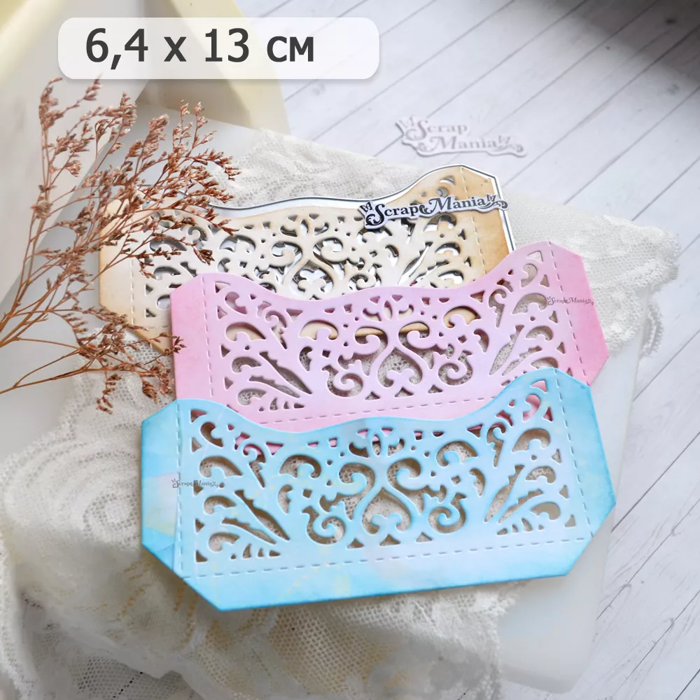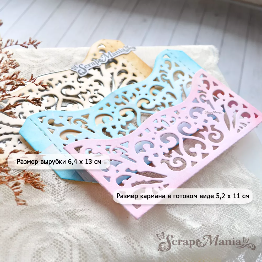 Размер 6,4х13 см, размер в готовом виде 5,2х11 см. Нож подойдет для оформления любых альбомов и блокнотов. Сделайте вырубку, пробигуйте края кармана по пунктирным линиям, сложите кармашек и приклейте его. Карман можно использовать для хранения фотографий или памятных деталей. Сочетайте вместе с ножом "Ажурный карман. Большой" (арт. 249591)