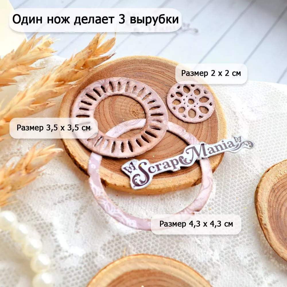 Размер 4,3х4,3 см. Один нож вырубает три элемента. Размер вырубки маленького круга 2х2 см, среднего круга 3,5х3,5 см, большого круга 4,3х4,3 см. Прекрасное дополнение к любым стилям