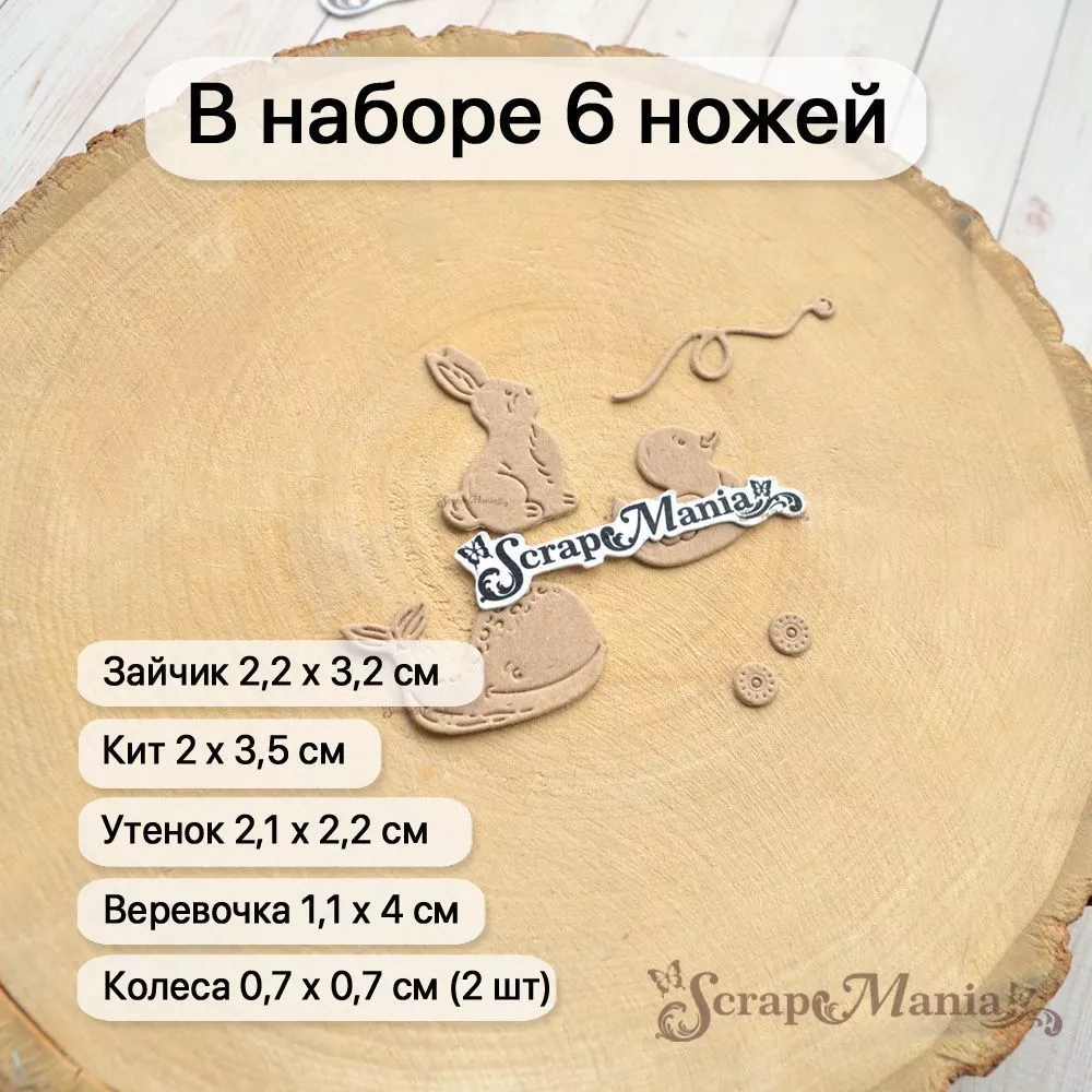 В наборе 6 ножей, соединенных перемычкой, которую при необходимости можно перекусить. Общий размер ножа 4,9х5,7 см. Размер зайчика 2,2х3,2 см, кита 2х3,5 см, утенка 2,1х2,2 см, колес 0,7х0,7 см, веревочки 1,1х4 см. Чудесный нож позволит Вам проявить невероятную фантазию в своих работах. Компонуйте, меняйте, переставляйте местами вырубку и создавайте свой невероятный дизайн. Отлично сочетается с другими ножами из серии "Детство" (арт. 255649, 255655 и др)