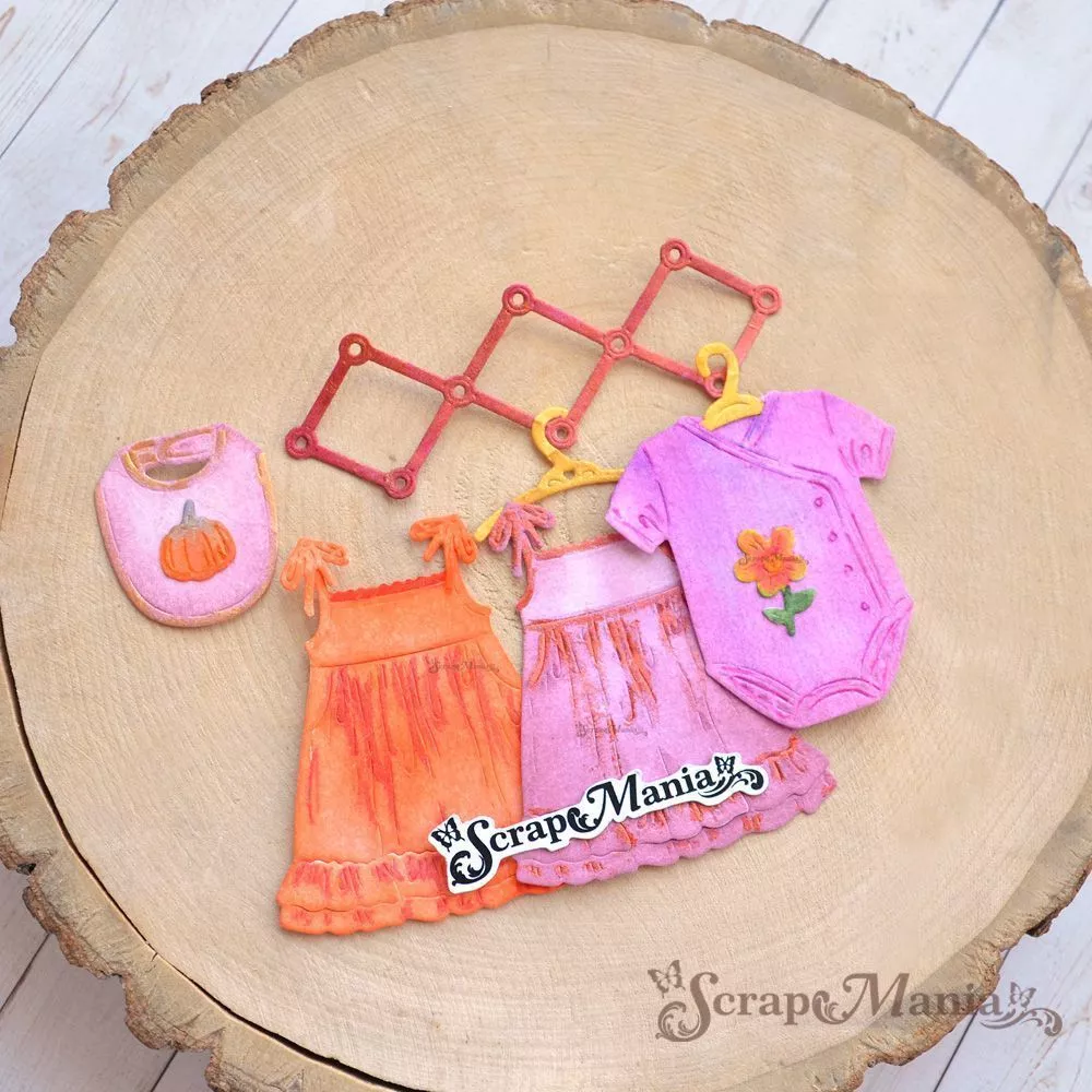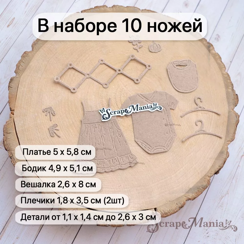 В наборе 10 ножей, соединенных перемычкой, которую при необходимости можно перекусить. Общий размер ножа 8,6х11,3 см. Размер платья 5х5,8 см, бодика 4,9х5,1 см, вешалки 2,6х8 см, плечиков 1,8х3,5 см (2 шт), слюнявчик 2,6х3 см, деталей от 1,1х1,4 см до 1,3х1,9 см. Идеальное дополнение к детским работам. Чудесный нож-конструктор позволит Вам проявить невероятную фантазию в своих работах. Компонуйте, меняйте, переставляйте местами вырубку и создавайте свой невероятный дизайн. Отлично сочетается с другими ножами из серии "Детство" (арт. 255633, 255658 и др)