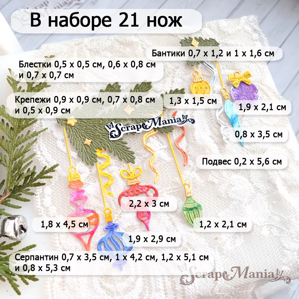 В наборе 21 нож-конструктор, соединенных перемычкой, которую при необходимости можно перекусить. Общий размер 7,4х10,8 см. Размер игрушек 0,8х3,5 см, 1,3х1,5 см, 1,2х2,1 см, 1,9х2,1 см, 1,9х2,9 см, 2,2х3 см и 1,8х4,5 см, подвеса - 0,2х5,6 см, серпантинок - 0,7х3,5 см, 1х4,2 см, 1,2х5,1 см и 0,8х5,3 см, крепежей 0,9х0,9 см, 0,7х0,8 см и 0,5х0,9 см, блестинок 0,7х0,7 см, 0,5 х0,5 см, 0,6х0,8 см и 0,6х0,6 см, бантиков 0,7х1,2 см и 1х1,6 см. Прекрасно подойдет для создания декора к зимним страничкам, новогодним альбомам и открыткам. Отлично сочетается ножами из серии "Елочные игрушки" (арт. 252280), а также хорошо подойдёт к серии "Еловый лес" (арт. 252294, 252293 и др)