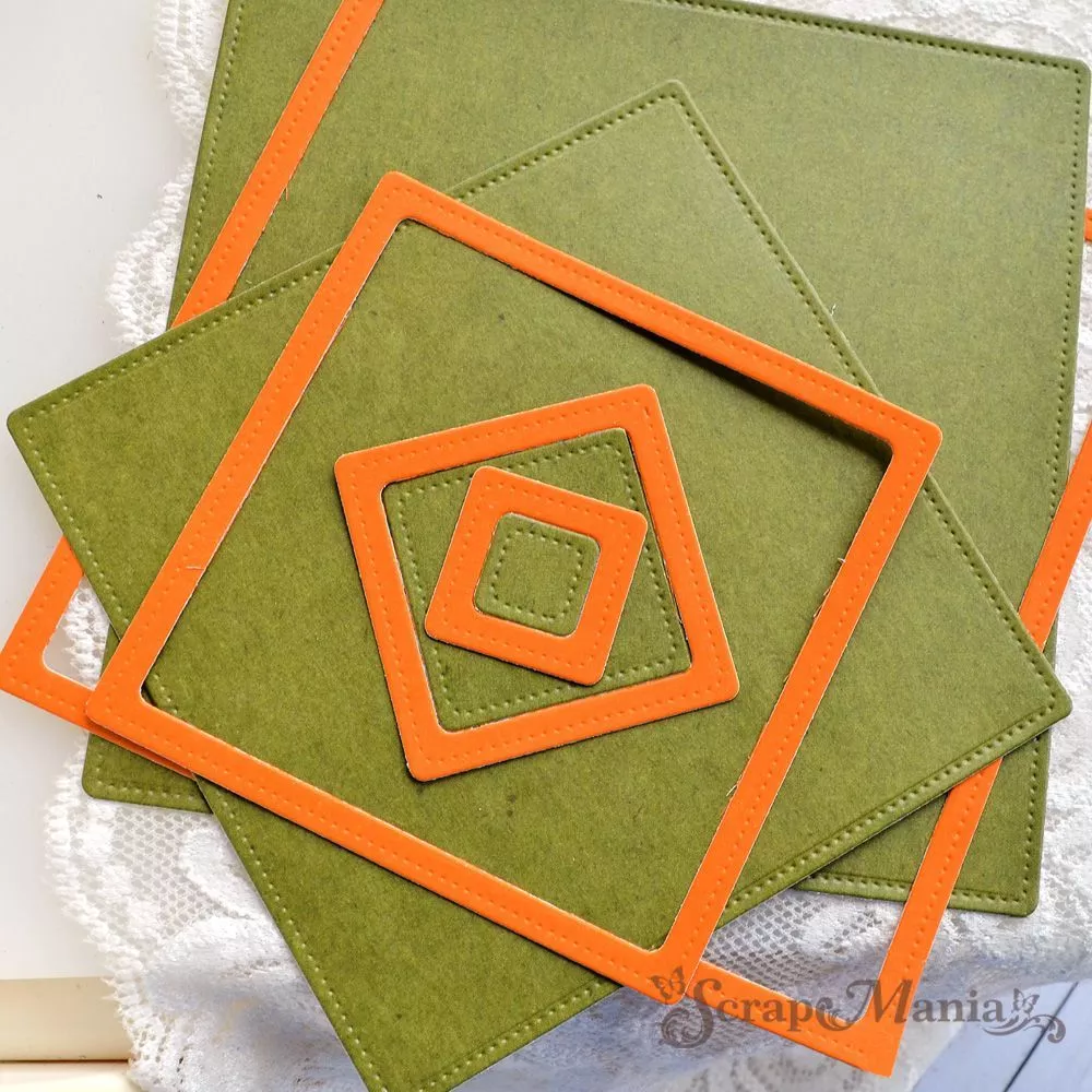 В наборе 12 ножей. Размер рамок 12,3х12,3 см, 11,3х11,3 см, 10,3х10,3 см, 9,3х9,3 см, 8,4х8,4 см, 7,3х7,3 см, 6,3х6,3 см, 5,4х5,4 см, 4х4 см, 3,4х3,4 см, 2,3х2,3 см и 1,3х1,3 см. Универсальный набор ножей. Пригодится во многих работах. С их помощью невероятно удобно делать рамочки под фото и подложки. Ножи можно вырубать по отдельности, тогда вы получите сплошную вырубку (без полости внутри квадрата). Или вырубать одновременно двумя ножами (меньший размер квадрата вкладывается внутрь большего ножа), тогда получится рамочка