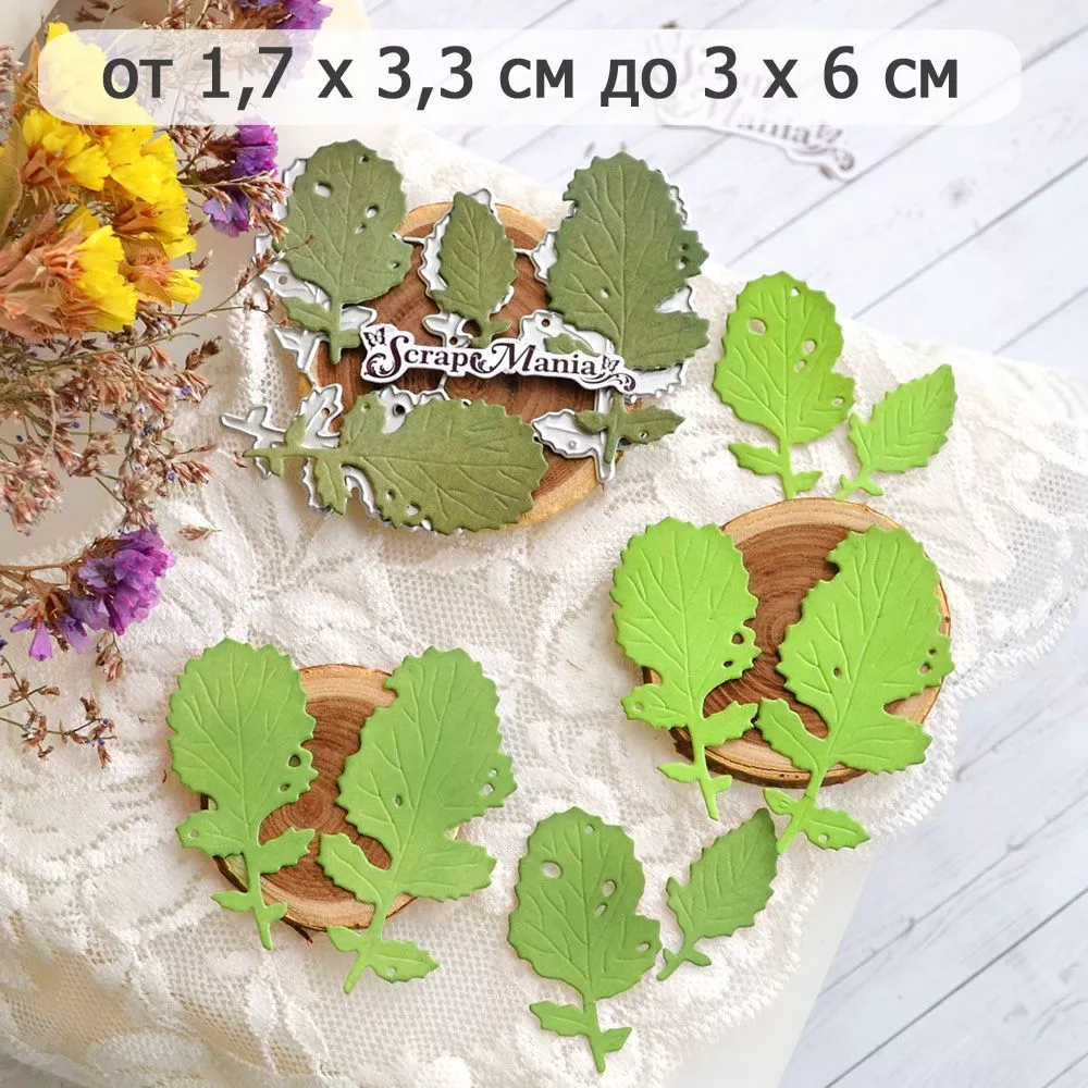 В наборе 4 ножа, соединенных перемычкой, которую при необходимости можно перекусить. Общий размер ножа 7,5х8,1 см. Размер листьев 1,7х3,3 см, 2,5х4,3 см, 2,5х5,2 см и 3х6 см. Идеальное дополнение к ботаническим альбомам, цветочным композициям и историям про сад-огород