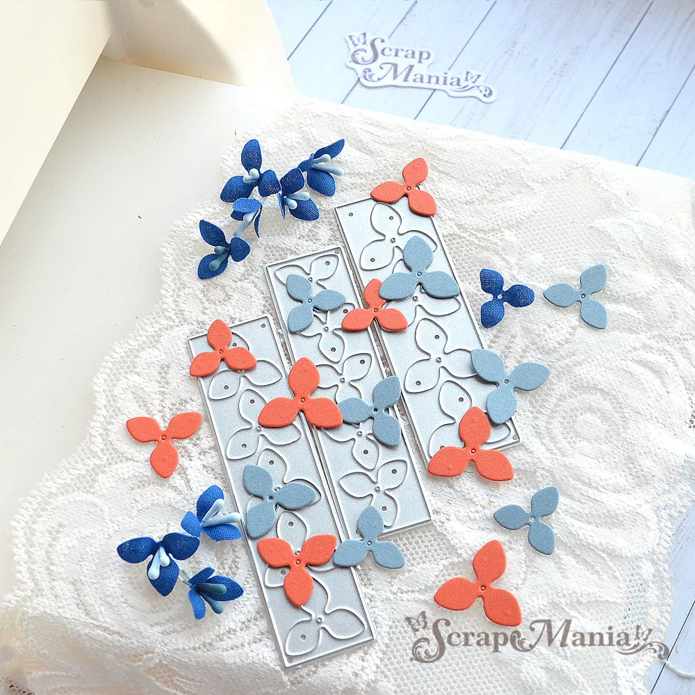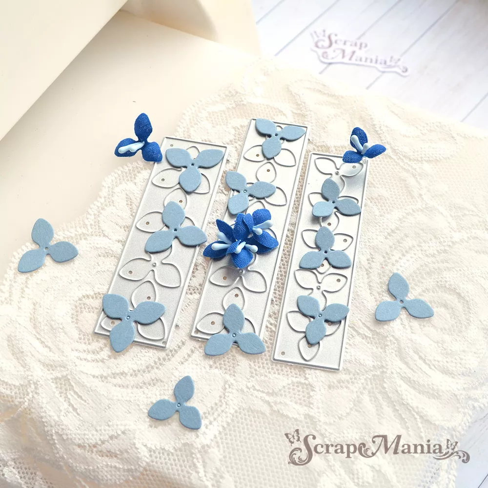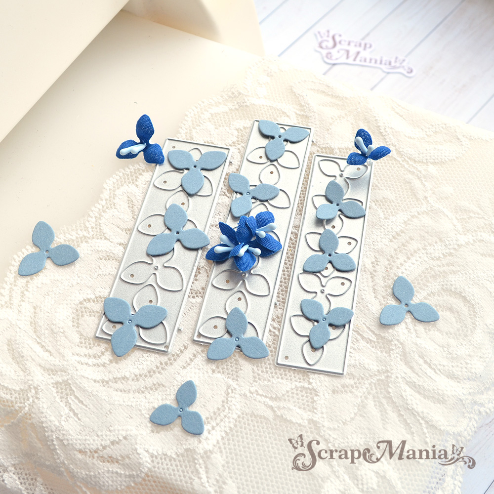 В наборе 3 ножа, соединенные перемычкой. Можно использовать их одним ножом или разъединить. Размер ножей 2,2х8 см, 2,5х8 см и 2,2х8,8 см. Размер вырубаемых цветочков 1,7х1,5 см, 2х1,8 см и 1,8х1,7 см