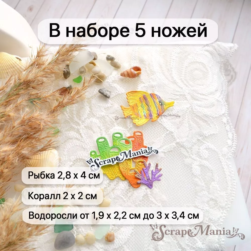 В наборе 5 ножей, соединенных перемычкой, которую при необходимости можно перекусить. Общий размер ножа 6х6,9 см. Размер: водоросли 1,9х2,2 см, 1,7х2,5 см и 3х3,4 см, коралл 2х2,2 см, рыбка 2,8х4 см. Прекрасно подойдет для создания декора к самым разным тематикам, а особенно к летним страничкам и альбомам об отпуске. А также идеально дополнят работы в деревенском стиле. Отлично сочетается с другими ножами из серий "Пляж" (арт. 255664, 255668 и др), "Море" (арт. 255673, 255676 и др) и с нашими коллекциями бумаги "Море, я скучала", "Мой капитан", "Океания" и "Морячок"