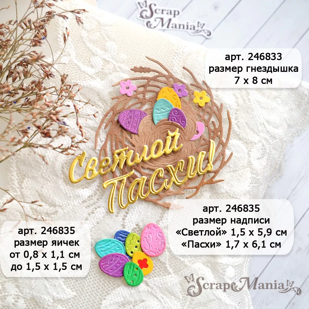 В наборе 6 ножей, соединенных перемычкой, которую при необходимости можно перекусить. Общий размер ножа 3,6х8,9 см. Размер слова "Светлой" 1,5х5,9 см, слова "Пасхи!" - 1,7х6,1 см, яичек от 0,8х1,1 см до 1,2х1,5 см, веточки 0,9х1 см. Нож-конструктор отлично подойдет для создания пасхального декора, открыток и весеннего настроения. Сочетается со всеми ножами из серии "Пасха" (арт. 246829, 246830, 246832, 246833, 246834 и др)