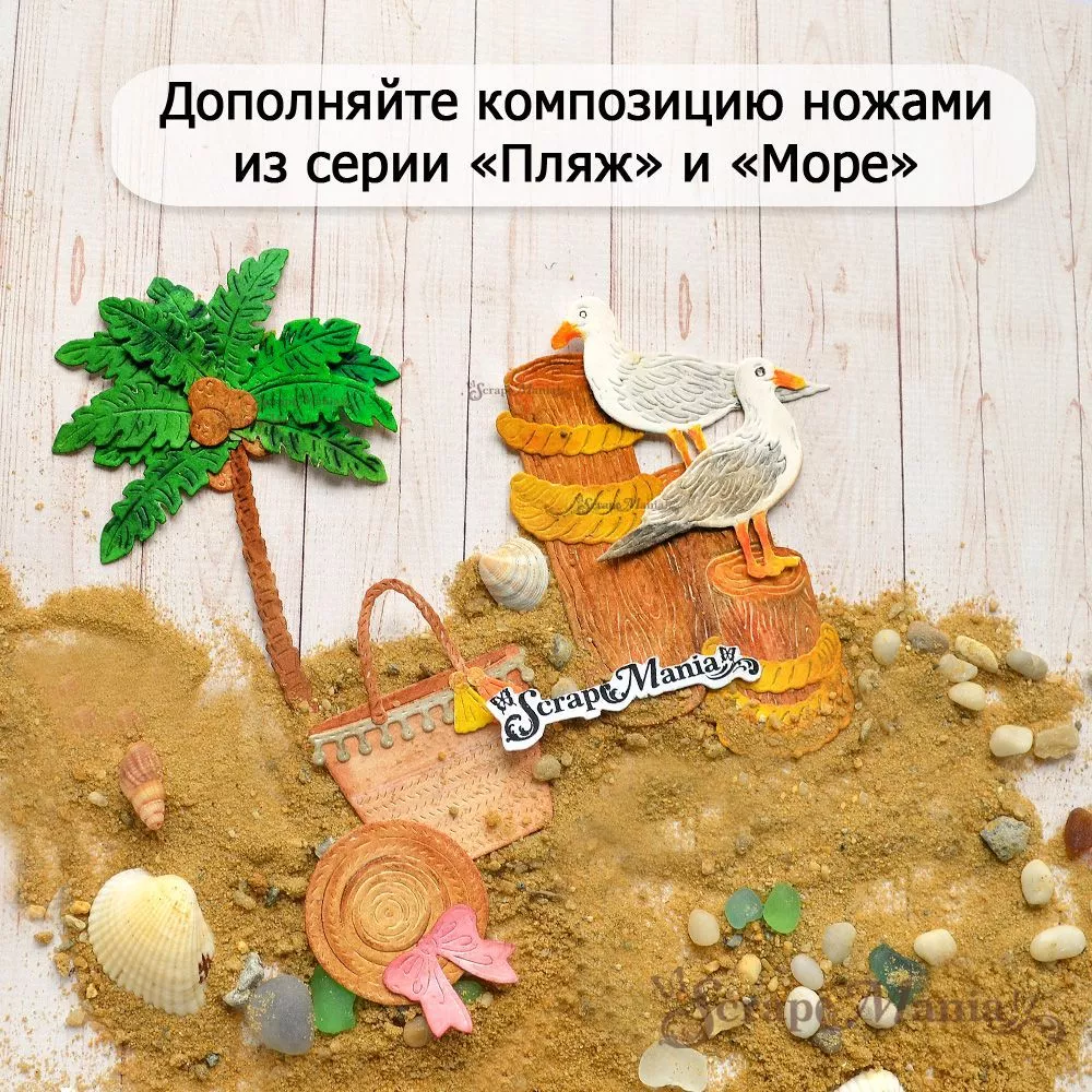 В наборе 9 ножей, соединенных перемычкой, которую при необходимости можно перекусить. Общий размер ножа 7,8х7,7 см. Размеры: ствол 0,6х6,5 см, листья 1,3х2,8 см, 1,1х3,5 см, 1,3х3,6 см, 2х3,7 см, 3х3,5 см, 3,2х3,5 см, 2,4х3,6 см, кокосы 1,4х1,4 см. Нож-конструктор прекрасно подойдет для создания декора к самым разным тематикам, а особенно к летним страничкам и альбомам об отпуске. А также идеально дополнят работы в деревенском стиле. Отлично сочетается с другими ножами из серий "Пляж" (арт. 255666, 255667 и др), "Море" (арт. 255672, 255676 и др) и с нашими коллекциями бумаги "Море, я скучала", "Мой капитан", "Океания" и "Морячок"