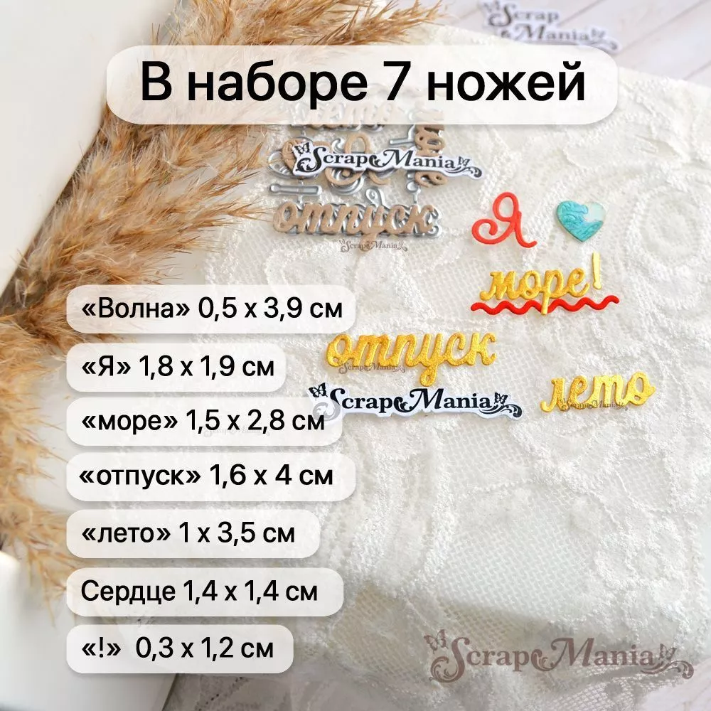 В наборе 7 ножей, соединенных перемычкой, которую при необходимости можно перекусить. Общий размер ножа 5х4,6 см. Размер слов: "море" 1,5х2,8 см, "Я" 1,8х1,9 см, "лето !" 1х3,5 см, "отпуск" 1,6х4 см, восклицательный знак 0,3х1,2 см, размер сердечка 1,4х1,4 см, волны 0,5х3,9 см. Прекрасно подойдет для создания декора к самым разным тематикам, а особенно к летним страничкам и альбомам об отпуске. А также идеально дополнят работы в деревенском стиле. Отлично сочетается с другими ножами из серий "Пляж" (арт. 255666, 255667 и др), "Море" (арт. 255672, 255676 и др) и с нашими коллекциями бумаги "Море, я скучала", "Мой капитан", "Океания" и "Морячок"