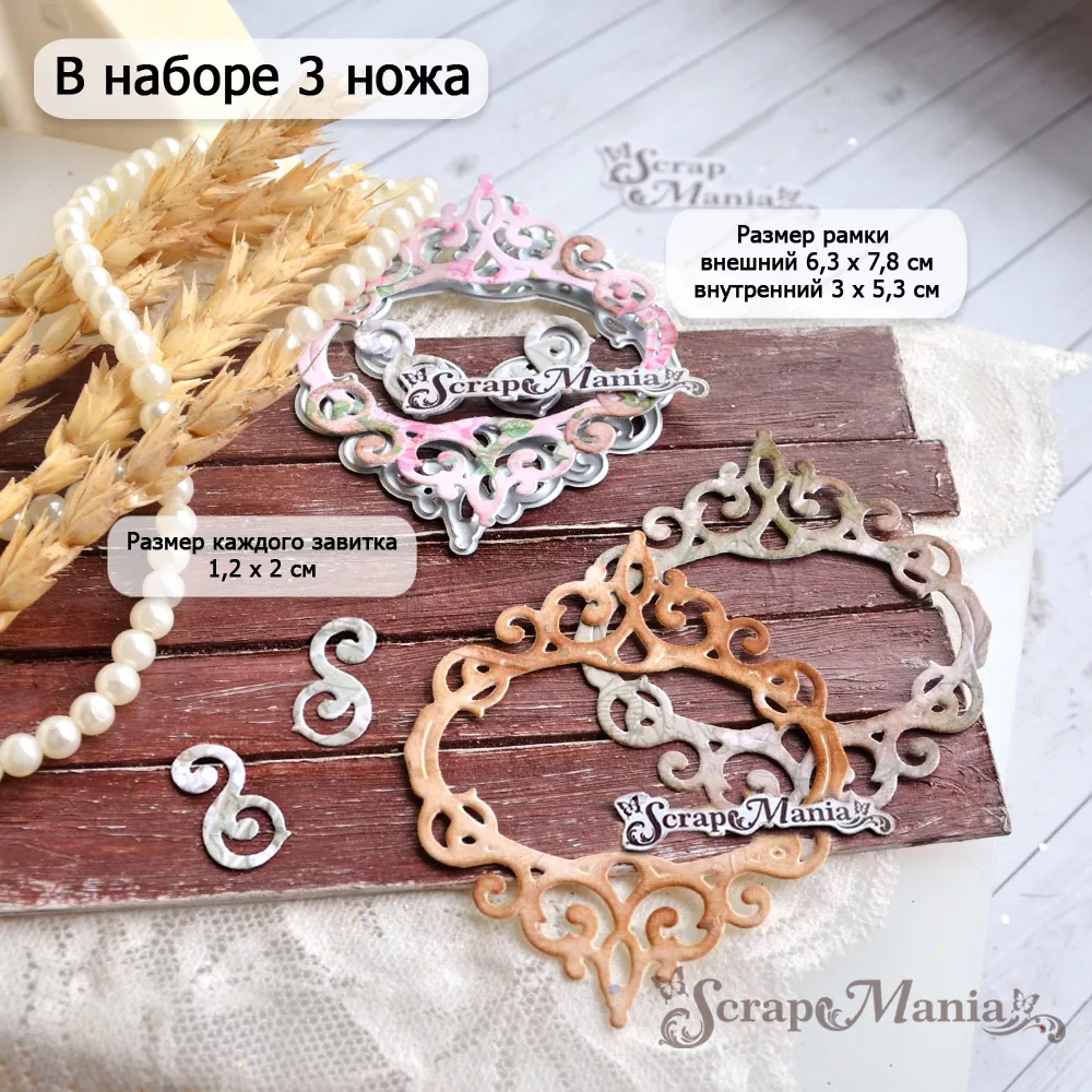 В наборе 3 ножа, соединенных перемычкой, которую при необходимости можно перекусить. Общий размер ножа 6,5х8 см. Размер рамки внешний 6,3х7,8 см, внутренний 3х5,3 см, размер каждого завитка 1,2х2 см. Подойдет для оформления блокнотов, винтажных альбомов, архивных страничек и много другого