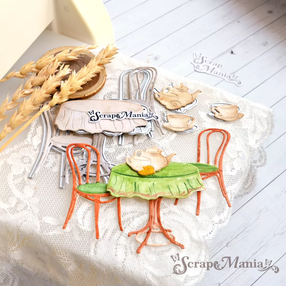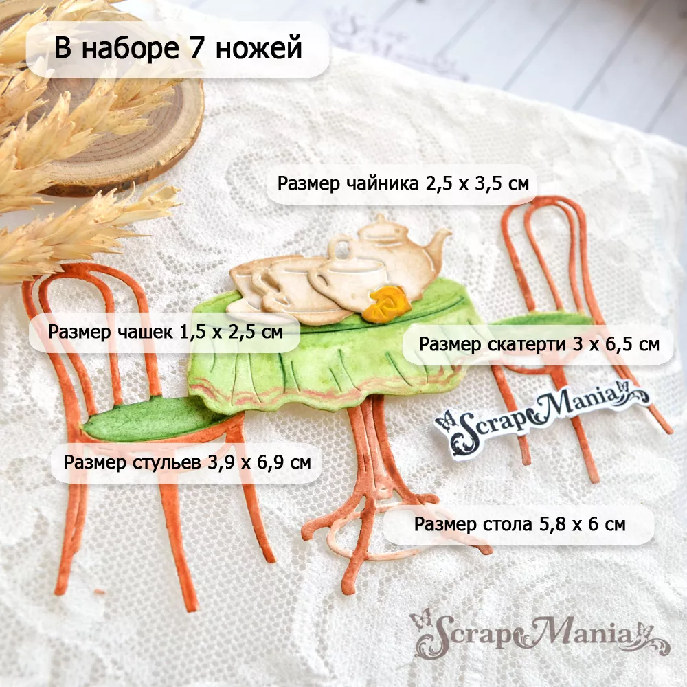 В наборе 7 ножей, соединенных перемычкой, которую при необходимости можно перекусить. Общий размер ножа 10,3х12,4 см. Размер стола 5,8х6 см, скатерти 3х6,5 см, стульев 3,9х6,9 см, чайника 2,5х3,5 см, чашек 1,5х2,5 см. Нож подойдет для создания декора к семейным страничкам, летним открыткам и кулинарным блокнотам. Отлично дополняет коллекцию "Рецепты старого буфета" и сочетается ножами из серии "Рецепты старого буфета" (арт. 249579, 249584, 249588, 249587, 249585 и др)