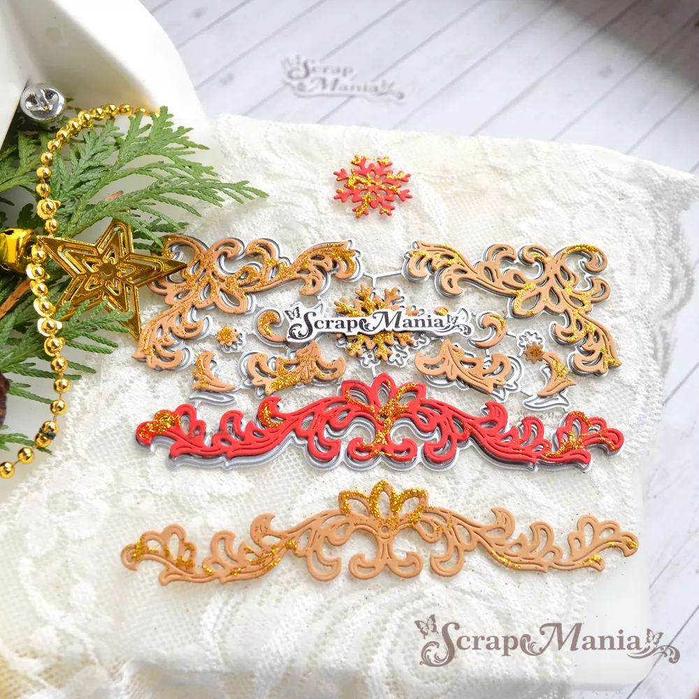 В наборе 14 ножей, соединенных перемычкой, которую при необходимости можно перекусить. Общий размер 6,9х12,7 см. Размер бордюра 2,5х12 см, уголков 4,3х5,7 см, снежинки 2,5х2,5 см, элементов 1,3х2,7 см, 1,1х1,5 см, 0,7х1,3 см, 0,7х0,9 и 0,7х0,7 см (каждого размера по 2 ножа). Прекрасно подойдет для создания декора к самым разным страничкам, новогодним альбомам и летним открыткам, а также идеально впишутся в сказочные идеи и задумки