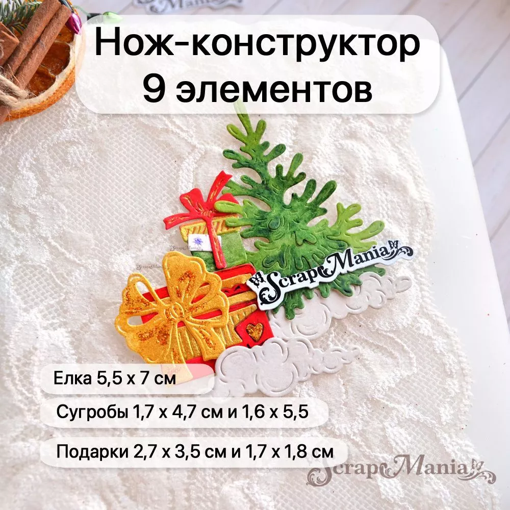 В наборе 9 ножей, соединенных перемычкой, которую при необходимости можно перекусить. Общий размер ножа 7,4х12,2 см. Размеры: елка 5,5х7 см, сугробы 1,7х4,7 см и 1,6х5,5 см, подарки 2,7х3,5 см и 1,7х1,8 см, бантики 3,2х3,2 см и 2,5х3 см, ствол 0,7х2 см, бирка 0,7х1 см. Нож прекрасно подойдет для создания декора к новогодним работам. Отлично сочетается с ножами из серии "Сказка на Новый Год" (арт. 250636, 250635, 250630, 250628, и др) и другими зимними дизайнами