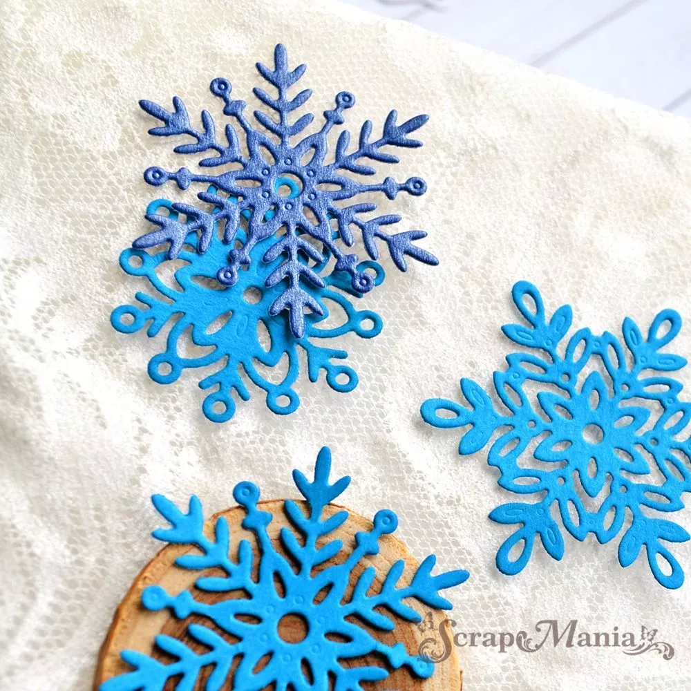 В наборе 3 ножа, соединенных перемычкой, которые при необходимости можно перекусить. Размер снежинок 3,8х3,8 см, 4,8х4,8 см и 5х5 см. Общий размер ножа 8,2х8,8 см. Ножи делают красивое тиснение на вырубке, что придает снежинкам еще большую ажурность и сказочность. Украшение прекрасно дополнит новогодние и зимние работы. Творите волшебство своими руками