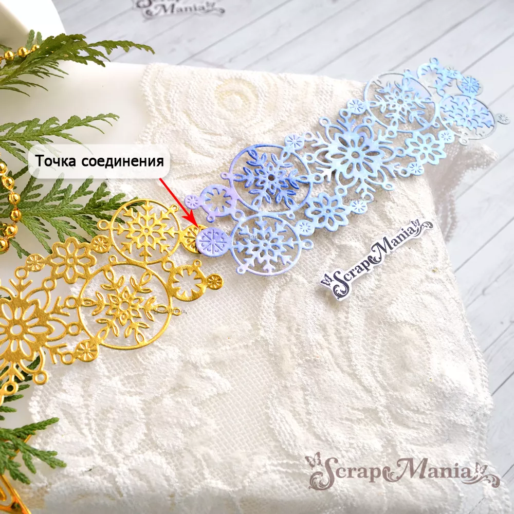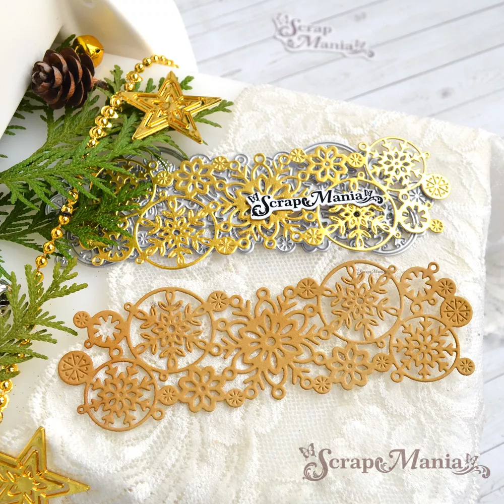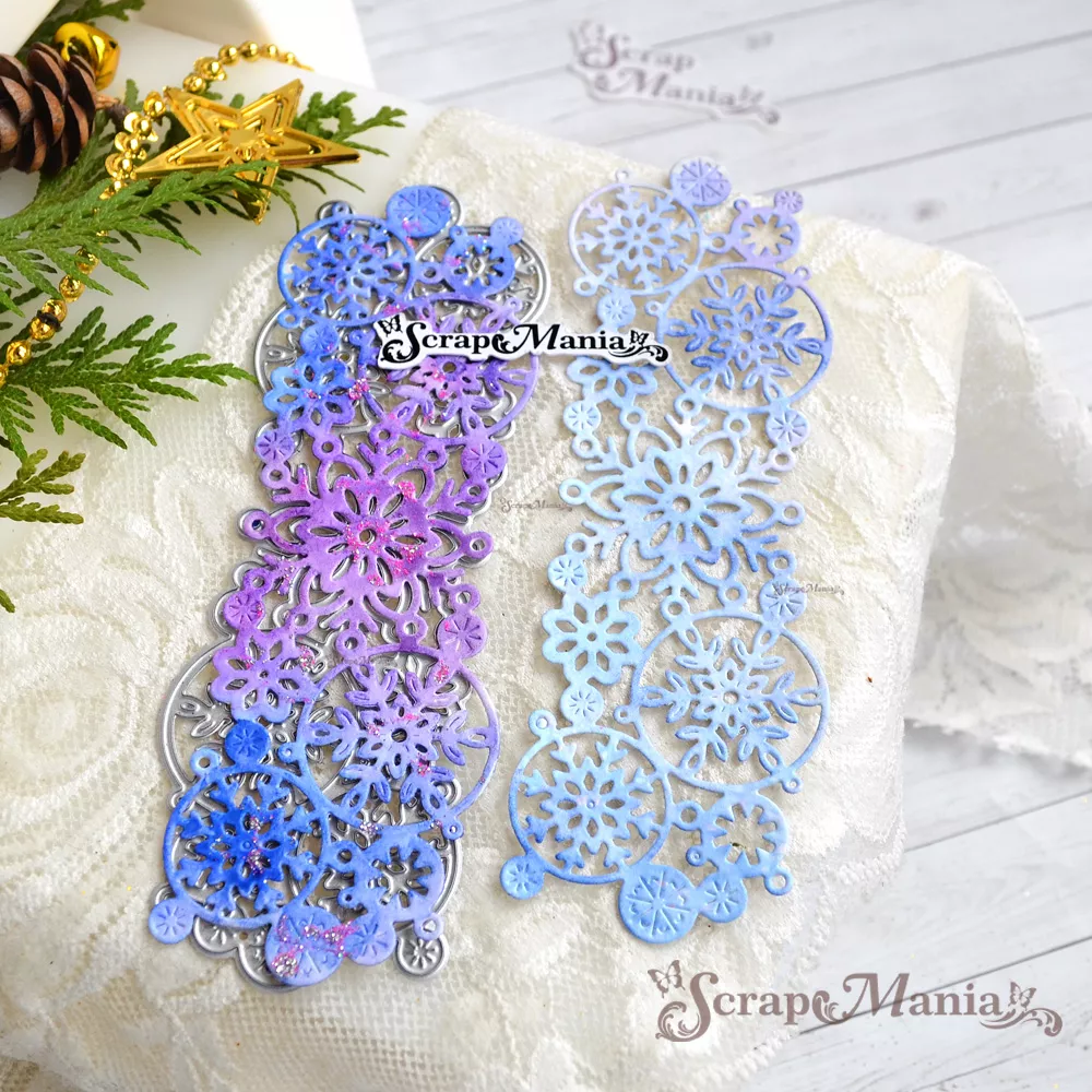 Размер 4,7х14 см. Из вырубки можно собрать бесшовный бордюр. Узор с обеих сторон имеет маленькие кругляшки, которые совмещаясь друг с другом образуют красивый непрерывный узор. Прекрасно подойдет для создания декора к зимним страничкам и альбомам